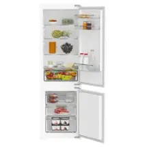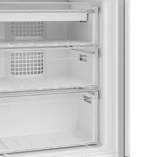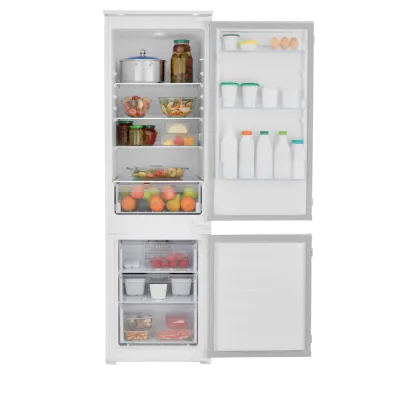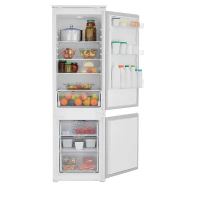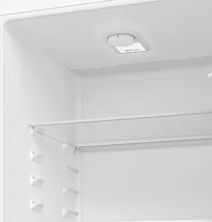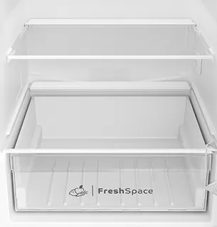 Холодильное отделение имеет три регулируемые полки из закаленного стекла и столько же дверных полок, отделение для овощей и фруктов и подставку для яиц.